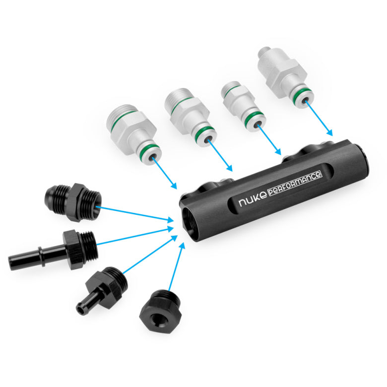 The fuel log fittings are available in several different sizes, make sure to select the preferred one when placing your order. Make sure to select the right amount of fittings needed, the Nuke Performance fuel log needs to fuel log fittings to operate.
